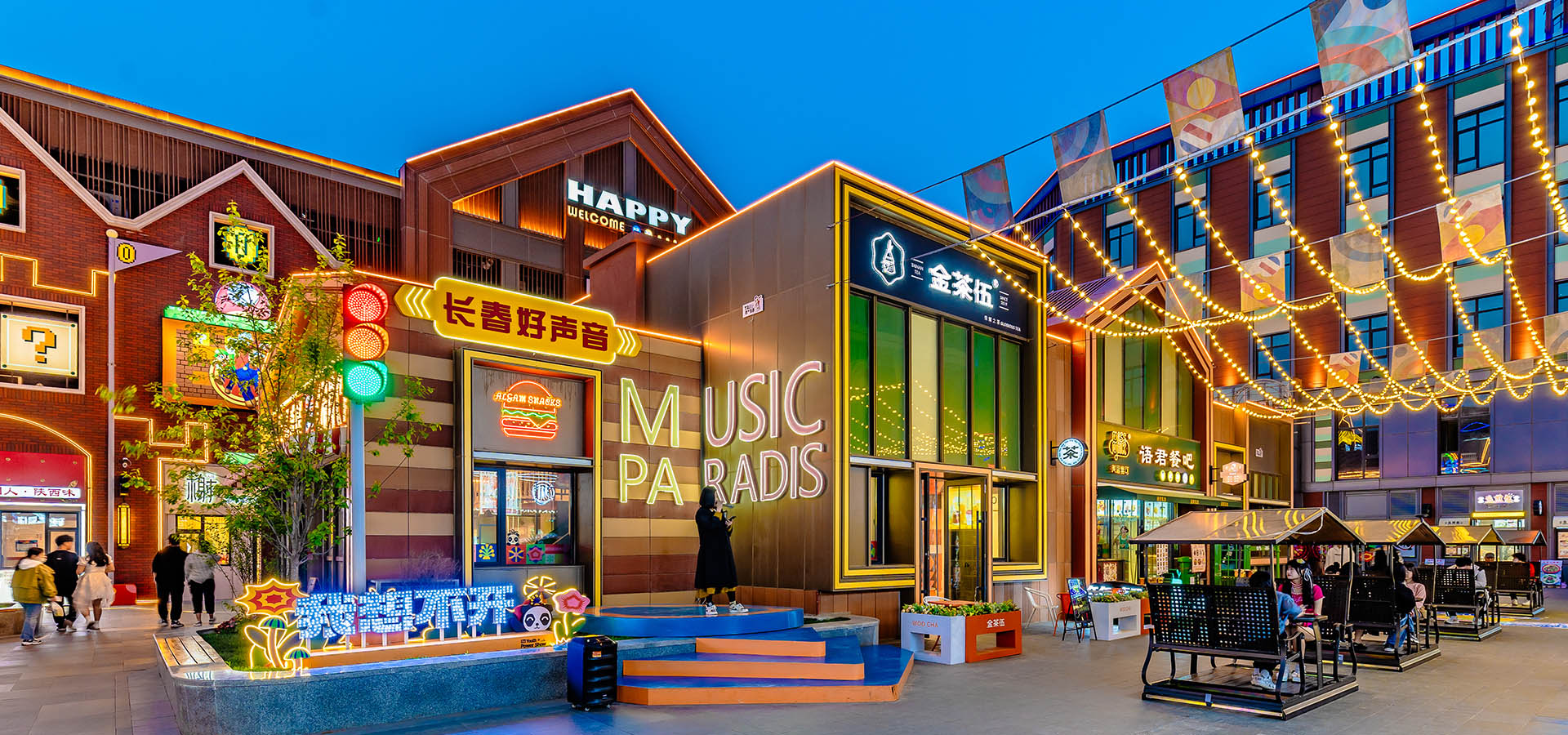 融合美食體驗(yàn)、主題演藝、文化體驗(yàn)、社交娛樂等多元形式,使其成為具有長春文化特色與人文氣息的代表性商街,將南美文化與國潮文化、藝術(shù)與休閑有機(jī)結(jié)合,有聲、有光、有電、有美食,有社交......用IP塑造場景,營造適宜尺度下的極限引流,打造國內(nèi)特色、長春唯一的輕文旅主題特色商業(yè)街。